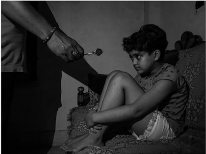 predation. In the second image, the same girl is shown sitting at home, crying,